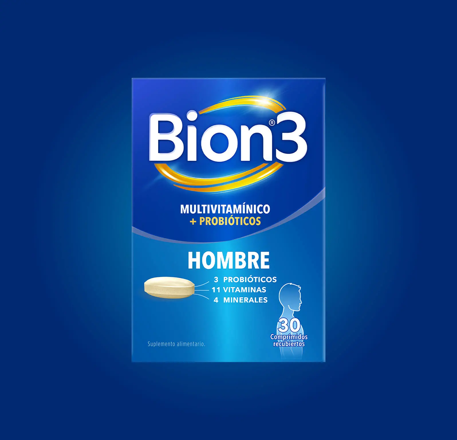 Bion3 Hombre es un suplemento alimenticio que combina 11 vitaminas, 4 minerales y 3 cepas probióticas.
